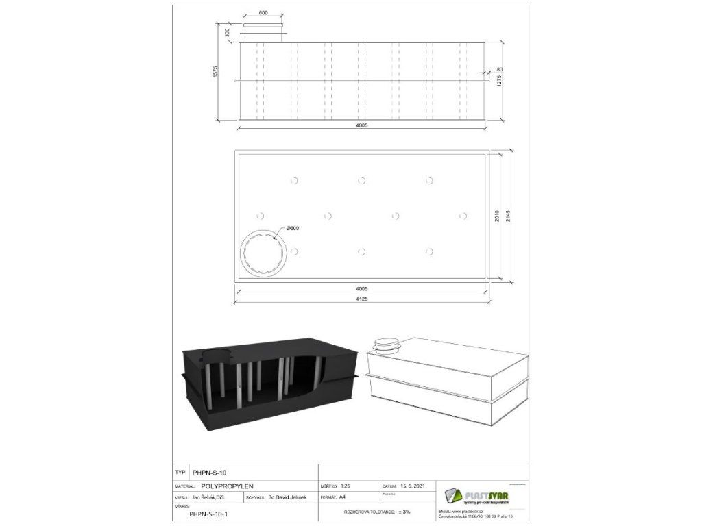 Nádrž je samonosná, svařovaná. Stěny a strop jsou vyrobeny z plastu o tloušťce 15 mm,